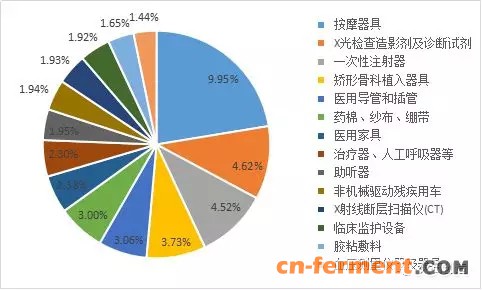 从我国医疗器械出口产品结构来看,目前我国医疗器械出口产品仍以低值耗材为主,虽然在高端医疗器械领域,国产超声、监护等影像设备以及人工关节等高值耗材在国际市场的影响力也逐渐显现,但出口规模仍然偏小。2017年,以按摩保健器具、医用耗材敷料为主的前十四大出口产品,占据我医疗器械出口总额的44%。电子诊断患者监测系统、超声波扫描电子诊断仪器、磁共振设备(MRI) 、B型超声波诊断仪等被增税产品对美出口额在我国对美医疗器械出口总额中占比不足10%。