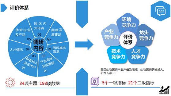 为全面了解我国生物医药技术及产业发展状况,更好地服务于生物医药科技成果转化及产业促进工作,中国生物技术发展中心在前期工作的基础上,开展了2018年园区生物医药技术及产业发展状况调研工作。调研范围主要包括国家级高新技术产业开发区(以下简称“国家级高新区”)和国家级经济技术开发区(以下简称“国家级经开区”),采取在线问卷填报系统的方式调查了各园区近3年在产业现状及成果转移转化、研发投入及技术产出、人才、企业、产品、环境等方面共计198项数据;并构建了包括环境竞争力、产业竞争力、技术竞争力、人才竞争力和龙头竞争力等5个一级指标和园区生物医药产业产值及增幅、生物医药研发投入、研发人员等21个二级指标的生物医药产业园区评价指标体系。最后,根据评价指标体系,利用标准化法计算得出各园区的竞争力综合评价指数,并形成了《2018年中国生物医药产业园区发展现状分析报告》(以下简称“《报告》”)。