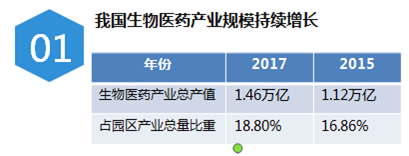 《报告》显示,近年来,我国生物医药产业规模持续增长,生物医药产值占医药产业的比重持续上升。2017年,全国生物医药产业总量约为3.8万亿元,所调研园区的生物医药总产值约1.46万亿元,较2015年增加了0.34万亿元,占全国生物医药产业总量达38.42%。2017年,所调研园区生物医药产业总产值占园区产业总量的比重从2015年的16.86%增加到了18.80%,特别是国家级高新区生物医药产业发展迅猛,占国家级高新区产业总量的比重从2015年的19.52%攀升至2017年的22.48%,生物医药逐渐成为园区的产业支柱之一。