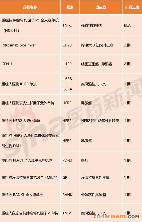 通过查询,海正药业开发的产品HS-016,已进入BLA状态,其靶点为TNF-α,适应症指向强直性脊柱炎(大家想起了哪个药王?);而处于临床2期的品种,共2个,包括作用于CD20、用于治疗弥漫大B细胞淋巴瘤的Rituximab biosimilar(这个品种,国内进度不算靠前);1期临床品种,共8个,适应症集中于肿瘤、免疫系统疾病。详情见下表:
