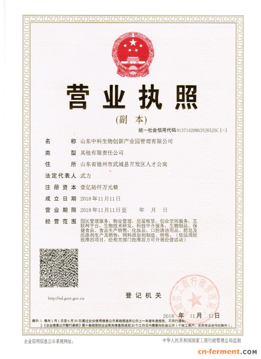 山东中科生物创新产业园项目由市经合局引进,配合武城县具体跟进落实,目前已完成注册,注册资本1.6亿元,落户武城县。该项目计划总投资12亿元,占地500亩,引进高科技生物技术团队,建设现代化商务办公区、会议中心、GMP认证的保健品、食品生产基地、酵素菌肥生产研发中心、院士专家工作站,以及全自动化发酵生产线、医药级冻干生产线、国家级原菌发酵车间等。项目建成投产后,预计年纳税近亿元,解决劳动力600人。