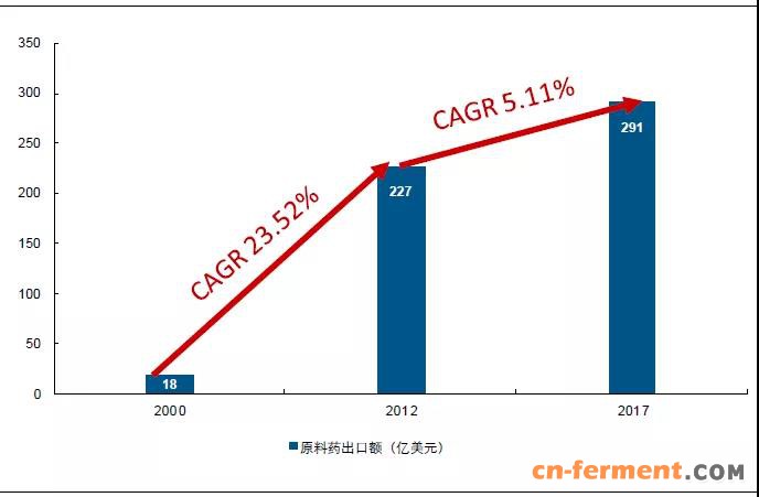 我国原料药的出口额从约 18 亿美元,增长至约 227 亿美元,复合增速更是达到了 惊人的 23.52%。