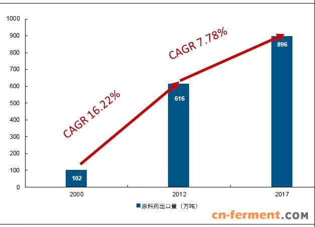 图 1:2000-2017 年我国原料药出口量