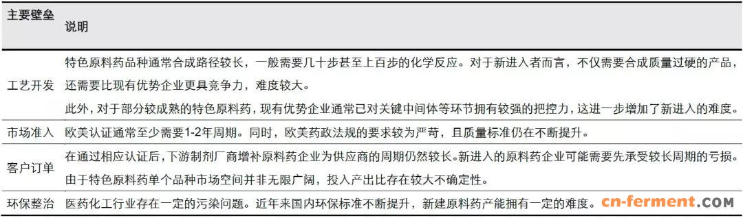 在目前产业环境下,对于潜在的新进入者而言,技术实力、原料和关键中间体来源、市场准入、客户订单、环保等环节均构成不小的挑战。总体而言,兑现周期较长、重置成本较高且盈利的不确定性较大。这为特色原料药品种维持寡头竞争格局并出现景气拐 点,奠定了良好的基础。