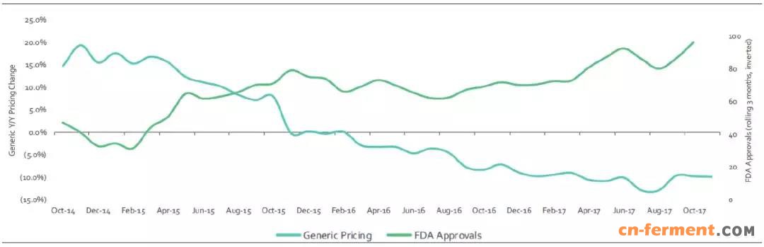 图 9:过去几年美国仿制药的价格随着批准文号的增多呈现平缓下降趋势