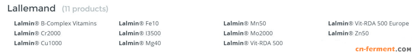 Lallemand致力於天然酵母的產品研發,提供各種以微量營養素和生物活性化合物為基礎的天然酵母。 Lallemand致力于天然酵母的产品研发,提供各种以微量营养素和生物活性化合物为基础的天然酵母。 旗下的品牌Lalmin®系列包含維他命B群(B-Complex Vitamins)、鉻、銅、鐵、鎂、錳、鉬、硒、鋅、維他命D、酵母葡聚醣等。 旗下的品牌Lalmin®系列包含维他命B群(B-Complex Vitamins)、铬、铜、铁、镁、锰、钼、硒、锌、维他命D、酵母葡聚糖等。