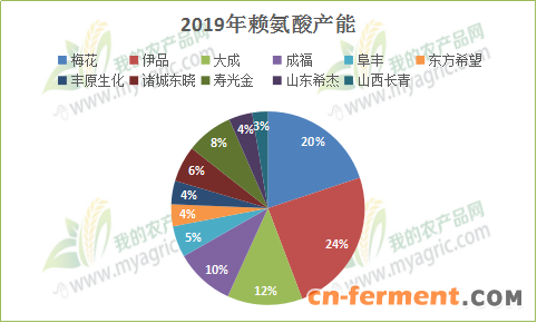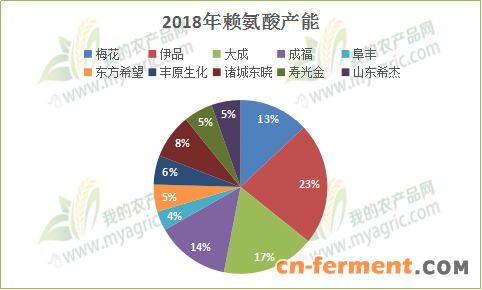 第四、2018年赖氨酸各厂家产能占市场的比例和2019年赖氨酸各厂家产能占市场的比例分布图对比可以看出,19年的厂家扩产情导致市场分布发生了一些微妙的变化。首先感受到的是赖氨酸的供应增加了,国内供应压力加大。