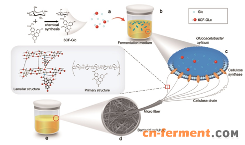针对上述问题,中科院青岛能源所生物基材料组群咸漠、张海波研究员带领课题组成员独辟蹊径开发出一种新型的功能化纳米细菌纤维素的制备方法—将6-羧基荧光素修饰的葡萄糖(6CF-Glc)作为底物,利用微生物Komagataeibacter sucrofermentans原位发酵产生具有非自然特征荧光功能性的BC。相关成果已发表于Nature Communications(DOI: 10.1038/s41467-018-07879-3)上。