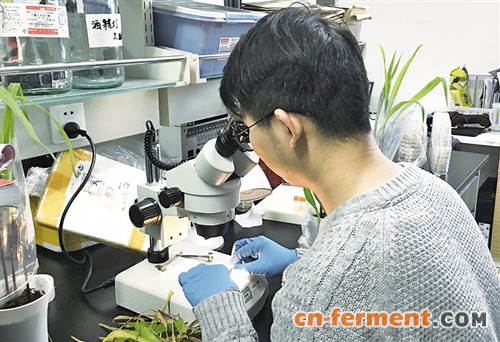 一名学生在实验室对玉米苗进行真菌样本采集。 记者 沈慧 摄