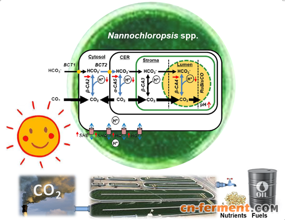 人类活动排放的CO2等温室气体,导致了全球气候变化和海洋酸化等重大环境和社会问题。利用工业产油微藻将烟道气等工业CO2排放源直接转化为柴油等先进生物燃料,对于减少温室气体排放、遏制全球气候变暖具有重要意义。包括微藻在内的海洋浮游植物适应了当前地球大气0.04%的CO2含量,每年固定了全球CO2固定量的40%。但是,烟道气中的CO2含量高于5%,是大气碳含量的百倍以上。由此导致的培养环境酸化,在降低生物污染发生几率的同时,也通常会抑制工业产油微藻的生长与繁殖,从而大幅度降低了工业生物固碳产油过程的经济性。微拟球藻(Nannochloropsis spp.)是一种在世界各地均可室外大规模培养的工业产油微藻。它们具有生长速度快、二氧化碳耐受能力强、海水淡水均可培养、遗传操作较完善等突出优点。青岛能源所单细胞中心魏力等研究人员,提出其利用和耐受CO2均与碳浓缩机制(Carbon Concentrating Mechanism; CCM)有关的科学假设。首先,运用系统生物学思路,结合亚细胞定位等研究手段,挖掘到与高CO2应激相关的一个关键靶点,即位于细胞质内的一个特殊的碳酸酐酶(Carbonic anhydrase;CA2)。与5% CO2培养下相比,CA2在极低CO2浓度下被特异性地激活,因此是CCM系统感受与应对环境中CO2浓度的关键基因。