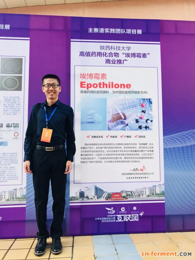 由他创立的“西安埃博瀚特生物科技有限责任公司”旗下的“高值药用化合物埃博霉素”创新创业项目,获得2018年第四届中国“互联网+”大学生创新创业大赛全国铜奖、陕西省金奖。目前国际上常用的抗癌药“紫杉醇”由于原料稀缺、价格昂贵不适合广泛应用,而该项目产品“埃博霉素”具有类似的抗癌机理,是世界公认的最具潜力的抗癌药物。他们团队经过苦心研究,通过新式生物发酵技术打破了国外对高活性抗癌原料“埃博霉素”的技术垄断,并将其产量提高20倍,纯度更是提升至99%。这使得我国对新型高效、价格较低的抗癌药物的研发成为可能。公司已与多家企业合作,并将产品销售给国内多家顶级研究机构,为我国和世界癌症患者带来新的希望。项目从立项到最后的获奖经历了近半年的时间,看似“水到渠成”的背后,其实是整个项目组长达10多年的积淀和努力。