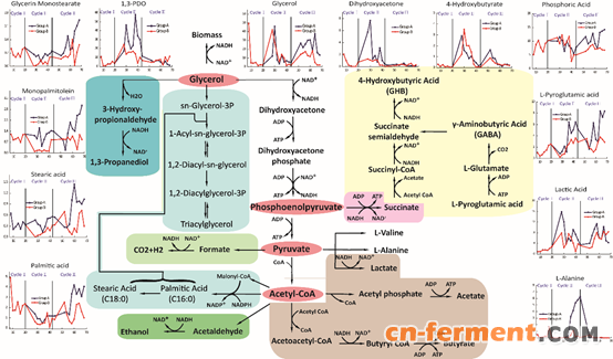 在此基础上,他们进一步构建了厌氧体系下丁酸梭菌的代谢组学平台,通过代谢组学的研究手段分析了添加和未添加活性炭体系中丁酸梭菌的代谢途径变化情况。最终得出结论,在副产物等外界环境压力的不断刺激下,菌体开始形成休眠体,使得代谢通路中碳源更多的流向油脂的合成过程,积累大量油脂,而活性炭的吸附作用为丁酸梭菌提供了更好的环境,代谢通路中的碳源依旧正常地流向1,3-丙二醇的合成途径。该研究不仅建立起丁酸梭菌反复分批稳定生产1,3-丙二醇的工艺,而且利用代谢组学的研究方法阐明了代谢途径的变化过程。