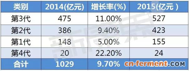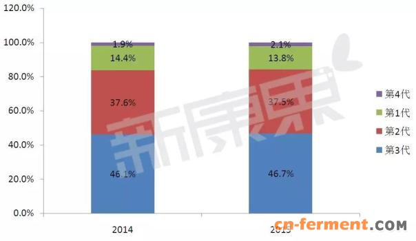 根据发明年代及抗菌性能的差异可将头孢菌素划分为第一代、第二代、第三代和第四代。据中康CMH监测数据显示,第三代和第二代头孢菌素为目前市场中坚骨干力量,2015年度第三代头孢菌素以几近市场半壁江山的份额稳居主导地位;紧随其后的第二代也拥有37.5%的高份额。而从增长情况来看,则是第四代增速最快,增长率为22.2%。
