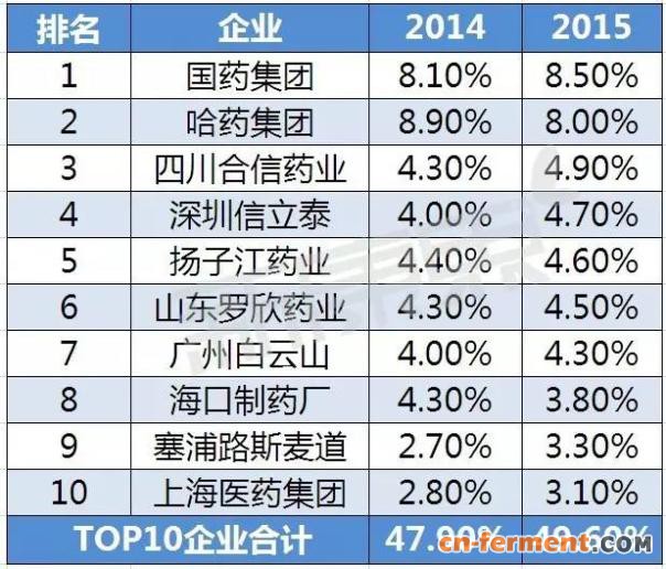 2015年度第二代头孢菌素前十企业总体规模为209.8亿元,同比增长13.5%,合计份额为49.6%。国药集团和哈药集团并驾齐驱,以8%以上的占比拉开了与其余企业之间的距离。塞浦路斯麦道是唯一进入前十位行列的外资企业。