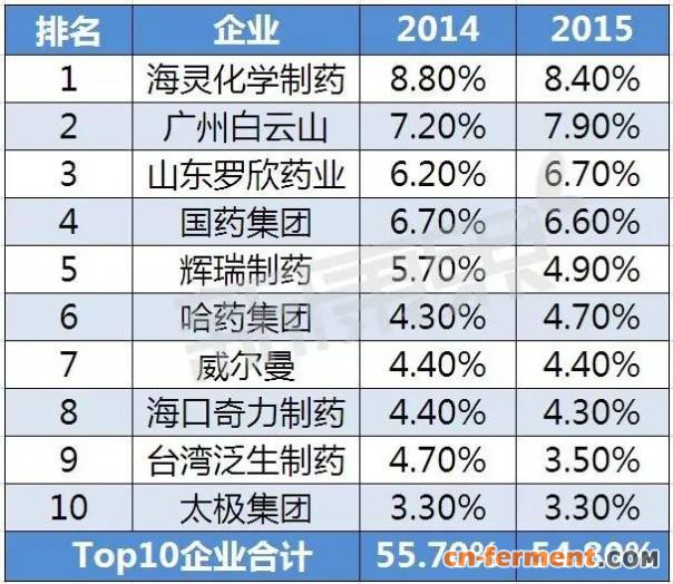 2015年度,第三代头孢菌素前十企业总体规模为288.4亿元,同比增长9.1%,合计份额为54.8%。海灵化学制药以8.4%的占比排名榜首,广州白云山和山东罗欣药业紧随其后。入围Top10的外资企业仅辉瑞制药和台湾泛生制药。