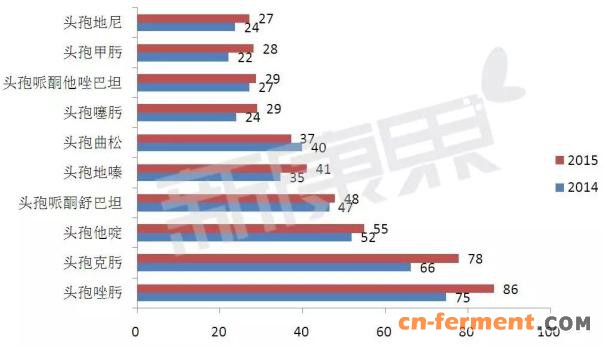 2015年度,第二代头孢菌素总体规模为422.7亿元,同比增长9.4%;其中头孢西丁、头孢呋辛钠、头孢美唑以及头孢孟多市场规模均在50亿元以上,合占比重57.8%以上。Top10中,头孢米诺、头孢丙烯和头孢尼西同比增长较快,增幅在20%左右。