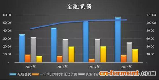 如上图所示,2015-2018年,海正药业金融负债逐年攀升,已经超过了营业收入的规模和增速。
