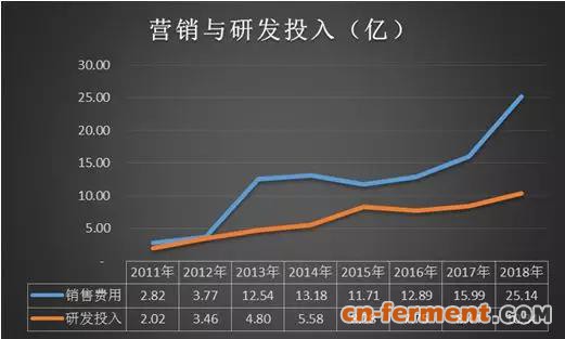 海正药业在营销上的投入明显高过了其在研发上的投入,8年累计的研发投入50.67亿,而累计在营销上投入高达98.04亿。在研发上的投入仅为营销投入的一半。