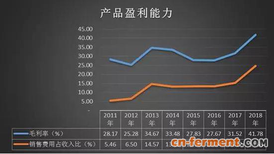 2018年,随着医药行业两票制的推行,海正药业毛利率有了大幅的提升,而营销的投入也是“空前”的。在41.78%的毛利率下,销售费用占收入比重高达了24.68%,也就是说公司近6成的毛利都是用于了营销。