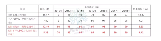 富阳制剂出口基地建设项目,预算12.19亿,起建时间已难以查询,追溯到2012年,该项目已经完工了90%,然而6年时间里,其工程进度一直徘徊在95%、98%、99%,似乎这个项目也停了下来。2018年末,该项目尚有5.63亿的在建工程。