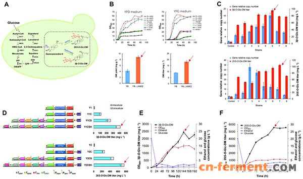 达玛烯二醇-Ⅱ(DM)、原人参二醇和原人参三醇是人参皂苷生物合成的关键中间体,后二者经糖苷化后即产生人参皂苷。但自然界中尚未发现达玛烯二醇-Ⅱ糖苷。该团队通过大肠杆菌系统表达人参的两个糖基转移酶基因,重组酶能分别糖基化DM生成两种达玛烯二醇-Ⅱ糖苷。药理实验结果显示,这两种达玛烯二醇-Ⅱ糖苷均具有良好的体内外抗结肠癌活性。在酵母底盘细胞中分别重构和优化它们的生物合成途径,经高密度发酵试验,这两种达玛烯二醇-Ⅱ糖苷的产量分别达到2.4 g/L和5.6 g/L(附图)。