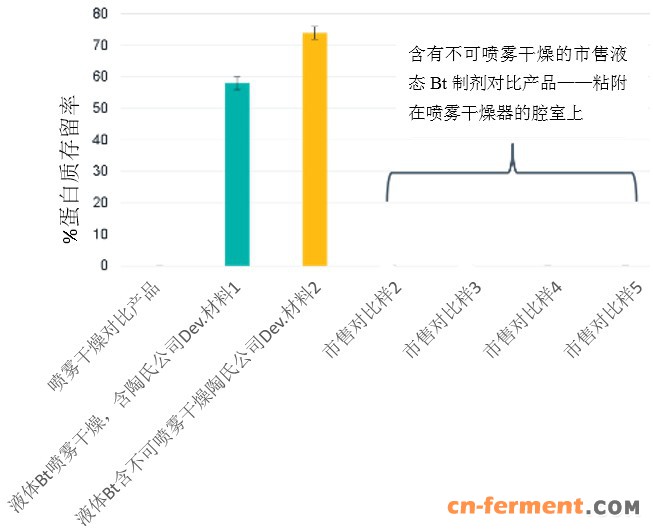 图2. 含有陶氏公司耐雨水冲刷材料的液体Bt制剂的喷雾干燥型和再分散后的蛋白质存留率。