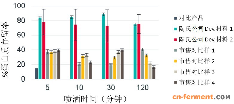 陶氏公司的这些新材料能够使液态Bt制剂即使在暴露于模拟雨水中两个小时之后,仍可留存75%的Cry蛋白。与之相比,对照Bt制剂暴露在模拟雨水中相同时间后,植物叶子的表面上已无Cry蛋白残留(图1)。这些材料可喷雾干燥,在进行喷雾干燥以及在水中再分散干燥产品后,暴露于模拟雨水后的Cry蛋白质存留率仍高达58%(图2)。测试的对比产品为不可喷雾干燥型,在测试过程中会粘附于喷雾干燥器的腔室上。