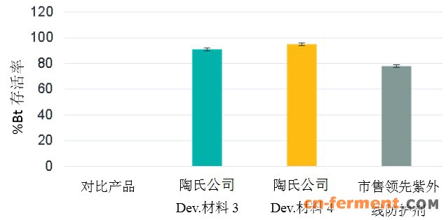 陶氏公司的材料也能增强Bt孢子抗紫外线的能力。Bt孢子在模拟阳光下暴露两小时后,存活率仍保持在95%。而对照制剂暴露于相同条件下时,则无存活孢子(图3)。