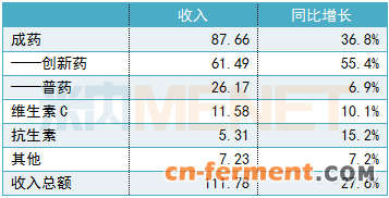 今年上半年,石药集团销售收入111.78亿元,同比增长27.6%,股东应占溢利18.78亿元,同比增长24.8%。其中,成药业务销售收入高达87.66亿元,同比增长36.8%;维生素C、抗生素和其他业务销售收入合计达24.12亿元。