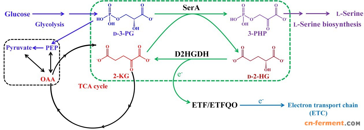 L-丝氨酸是生物体一碳单位的重要来源,也是甘氨酸、半胱氨酸、色氨酸及胸腺嘧啶等合成的前体。L-丝氨酸合成起始于3-磷酸甘油酸脱氢酶(SerA)催化的3-磷酸甘油酸脱氢。传统观点认为SerA通过与SerB、SerC的耦合推动L-丝氨酸的合成,该研究分析发现SerA、SerB、SerC的耦合并不能在热力学上支持L-丝氨酸的合成;同时证明SerA本身催化3-磷酸甘油酸脱氢与2-酮基戊二酸还原生成D-2-羟基戊二酸的偶联反应,该偶联反应在消除3-磷酸甘油酸脱氢的自由能壁垒、推动L-丝氨酸合成的同时,导致D-2-羟基戊二酸的产生。D-2-羟基戊二酸可通过D-2-羟基戊二酸脱氢酶催化其生成2-酮基戊二酸,重新进入中心代谢。该工作是在假单胞菌中完成的,但多项分析确认SerA与D-2-羟基戊二酸脱氢酶耦合推动L-丝氨酸合成的机制在动物、植物、微生物中都存在且发挥作用。