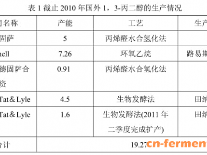 目前全球1,3-PDO(即1,3-丙二醇)的生产基本上被德国Degussa公司、美国Shell公司和美国DuPont司三家垄断。三个公司各自采用的是不同的技术路线。Degussa公司采用的是丙烯醛水合氢化法,壳牌公司采用的是环氧乙烷碳基化法,两个公司走的都是“石化合成路线”。另一家1,3-PDO生产商杜邦公司采用的是自己创新的生物工程法。2006年,杜邦公司的4.5万吨/年的生物法1,3-丙二醇生产装置投产。由于化学法的1,3-丙二醇生产较生物法的成本高,无法与生物法技术竞争,Shell公司的化学法装置自2009年开始全部停止生产了。所以,目前全世界只有DuPont公司的生物法装置在生产。