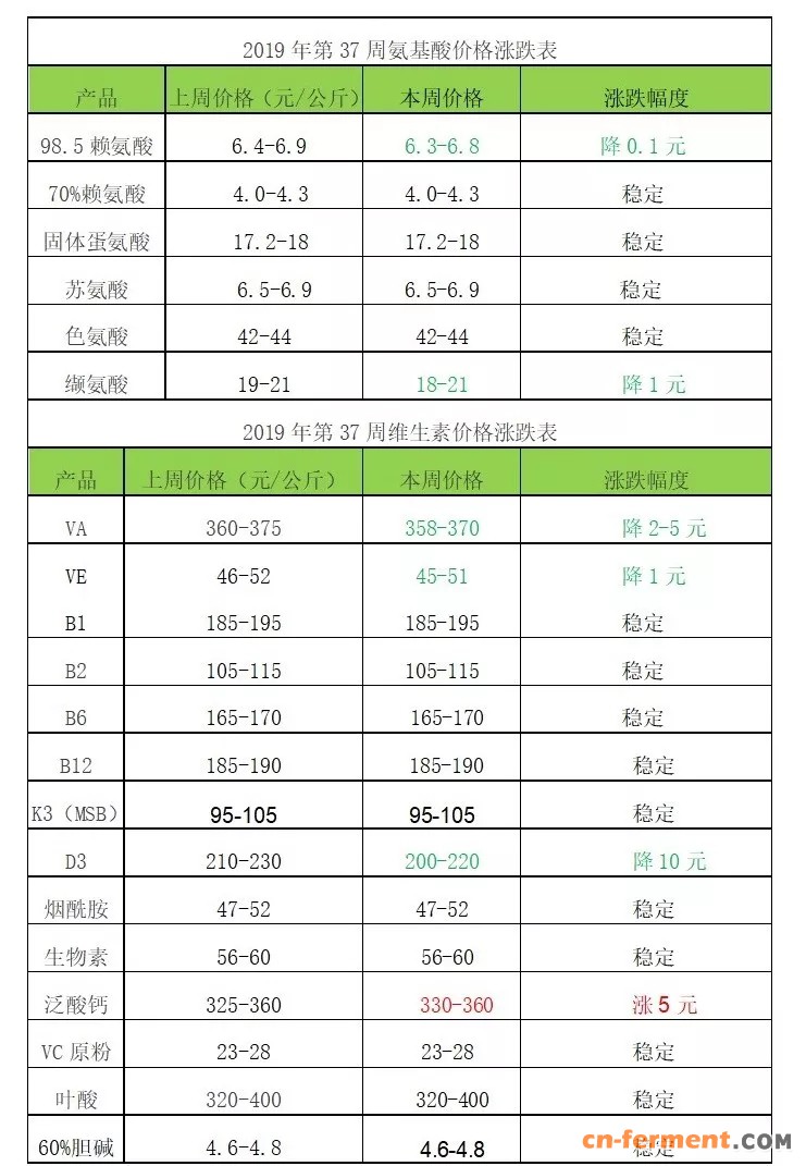 2019年第37周维生素市场动态