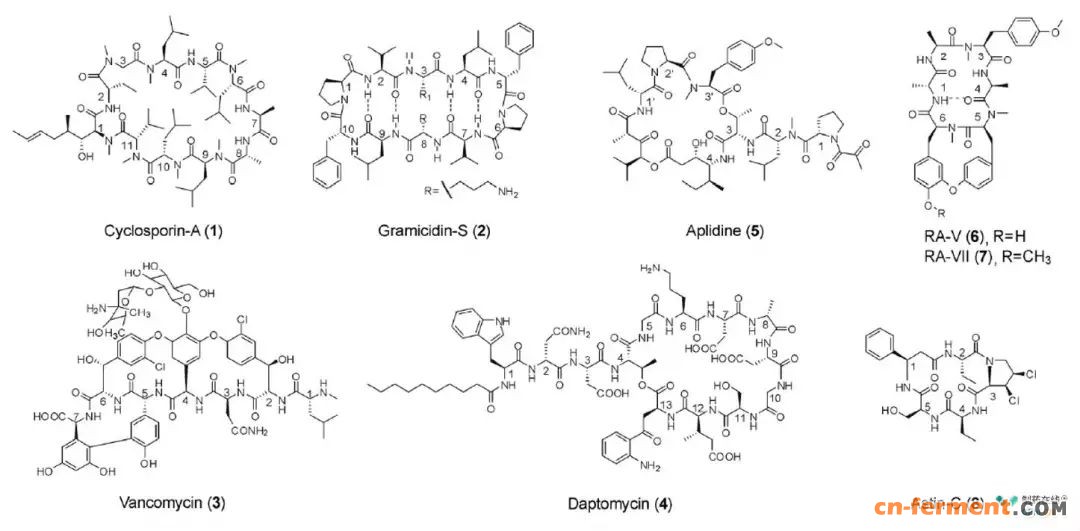 图一展示了目前一些研究较多的代表性活性环肽化合物,包括环孢菌素A (cyclosporin-A, 1)、短杆菌肽S(gramicidin-S, 2)、万古霉素 (vancomycin, 3) 和达托霉素 (daptomycin, 4), 海洋来源的aplidine (5) 及茜草科类型环肽 (RA-V, 6 和RA-VIII, 7)和菊科类型环肽 (astin-C, 8)。其中,环孢菌素A (cyclosporin-A, 1)、短杆菌肽S(gramicidin-S, 2)、万古霉素(vancomycin, 3) 和达托霉素 (daptomycin, 4)等多个环肽分子已经进入临床应用。