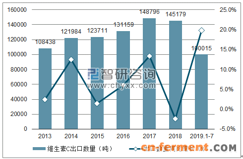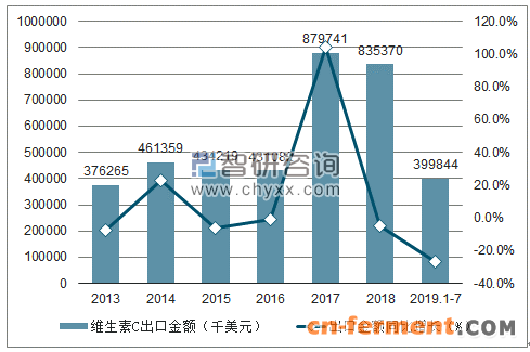 根据中国海关数据显示:2019年1-7月中国维生素C出口数量为100015吨,同比增长19.8%;2019年1-7月中国维生素C出口金额为399844千美元,同比下降26.8%。