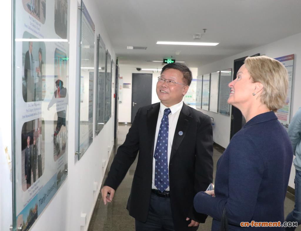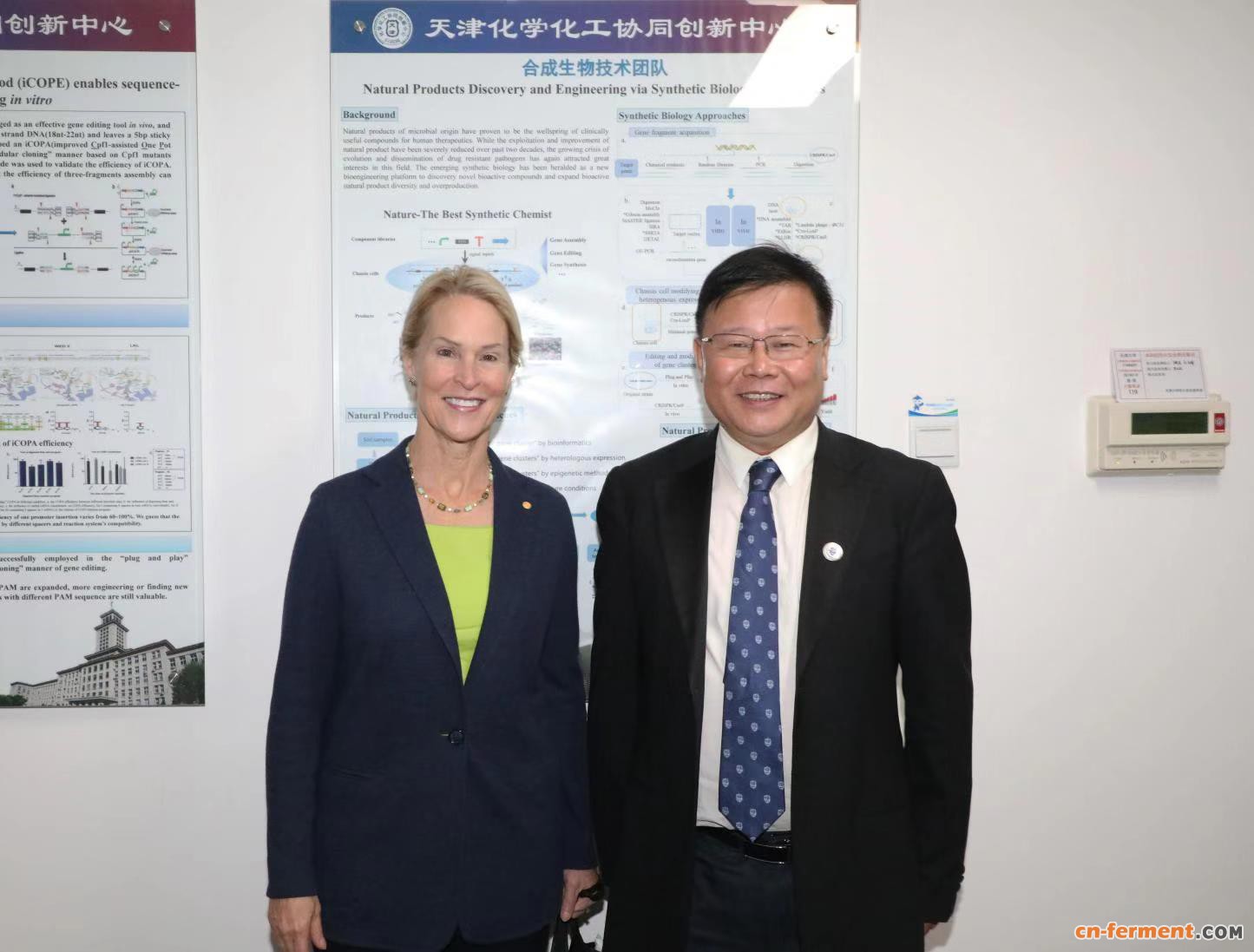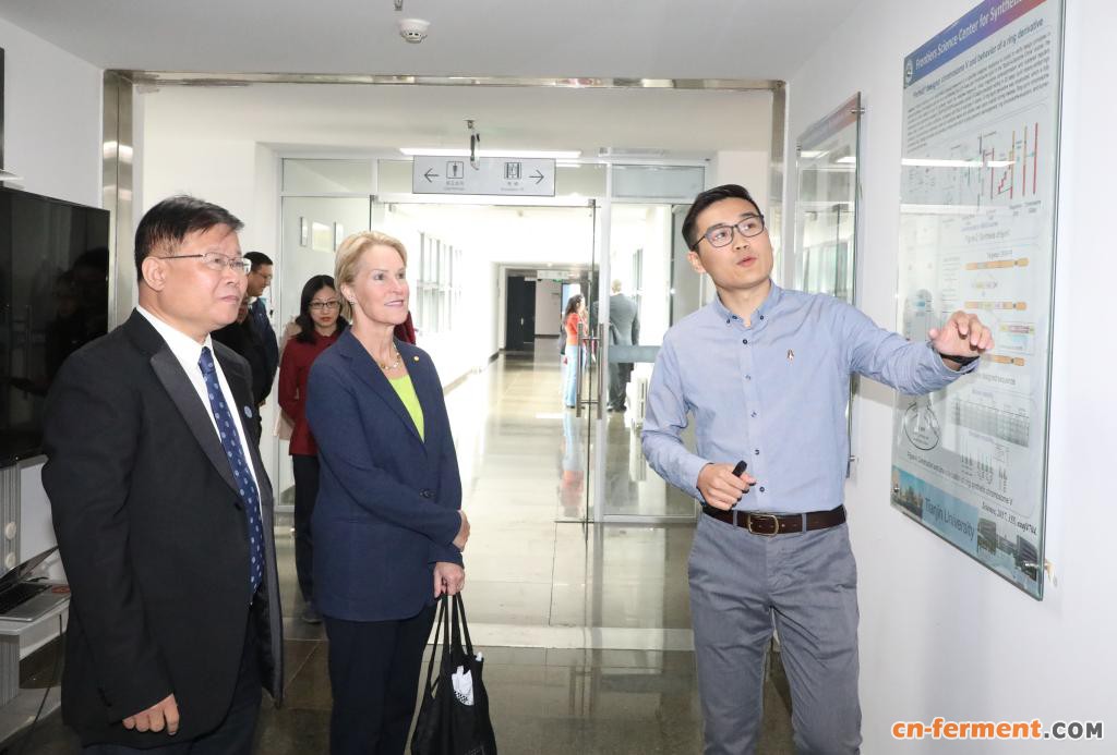 在天津大学,弗朗西斯·阿诺德参观了位于天津大学卫津路校区的合成生物学前沿科学中心。天津大学副校长、中心主任元英进教授详细介绍了合成生物学前沿科学中心的研究方向、国际合作情况和重要科研成果。在“真核生物基因组精准合成”和“基因组重排驱动进化”展板前,阿诺德教授与元英进团队开展密切交流,频频点头,对实验室在化学与生物交叉领域的学术成果给予赞许。在“新化学分子的酶进化”展板前,阿诺德教授和青年老师进行了密切交流,并对酶的设计给予指导,鼓励青年教师敢于挑战领域内公认难题。