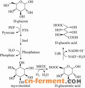 红茶菌是以含有葡萄糖的茶水为原料,经过醋酸菌、酵母菌和乳酸菌等多种微生物的复合体 (菌胶膜) 共同发酵而成的一种酸性饮料。一些学者对红茶菌发酵液中的成分进行了分析,发现其培养液中含有较高含量的葡萄糖二酸-1,4-内酯 (8.6 mg/mL),而在糖醛酸途径中葡萄糖二酸是葡萄糖二酸-1,4-内酯的前体,因而推测红茶菌发酵液中含有较高含量的葡萄糖二酸[58]。由于微生物是否存在糖醛酸途径尚未得到证实,该推断还需进一步验证才可以确认。也有研究者用HPLC/MS/PAD (高效液相色谱/质谱/光电扫描) 的方法对来自美国和世界其他地区的19种红茶菌样品进行了化学成分分析,未检测出葡萄糖二酸和葡萄糖醛酸[62]。由于培养条件、分析方法、菌种来源等差异得到的结果也存在差异,因此红茶菌是否可以以葡萄糖为原料发酵生产葡萄糖二酸还需更多研究加以证实。