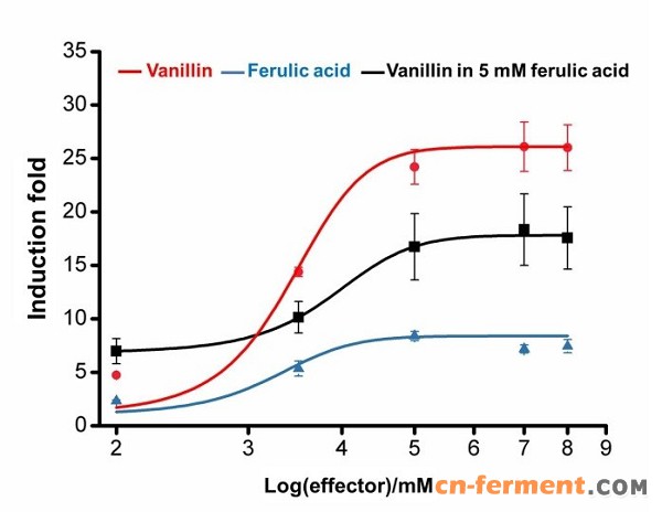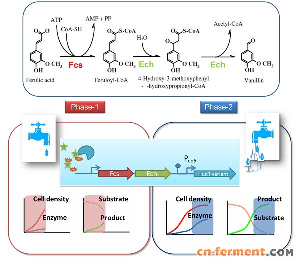 香草醛是可应用于食品、医药等领域的重要化合物。在生物合成时,香草醛对宿主菌有毒性,对细胞膜和胞内蛋白具有破坏作用。其抑制毒性在宿主菌生长前期表现尤为显著。以大肠杆菌为宿主细胞合成香草醛的途径之一是以阿魏酸为底物,经阿魏酰辅酶A合成酶(Fcs, trans-feruloyl-CoA synthetase)和烯酰基辅酶A水解酶/醛缩酶(Ech, enoyl-CoA hydratase/aldolase)两步催化完成。中国科学院微生物研究所唐双焱团队通过巧妙筛选调控蛋白识别效应物的特异性,设计构建可不同程度响应底物阿魏酸和产物香草醛累积浓度的动态调控元件,由此调控香草醛合成相关基因(fcs, ech)表达,研究显示受此调控元件控制的代谢通路在生物合成香草醛上比传统的组成型启动子、诱导型启动子及基于群感效应构建的启动子具有显著优势。在此基础上,对启动强度上做精细调控,以期缓解生长前期的代谢负担,增加生长后期代谢活性,最终有效提高香草醛产量。此项工作进一步拓展了蛋白质定向进化手段在代谢工程研究中的应用,为天然产物生物合成途径的设计构建提供了新的思路和调控元件。