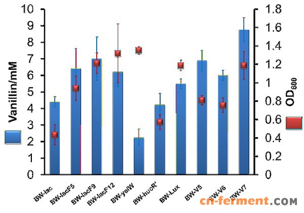 图3 该研究调控元件应用于香草醛生物合成与其他元件在香草醛产量的比较