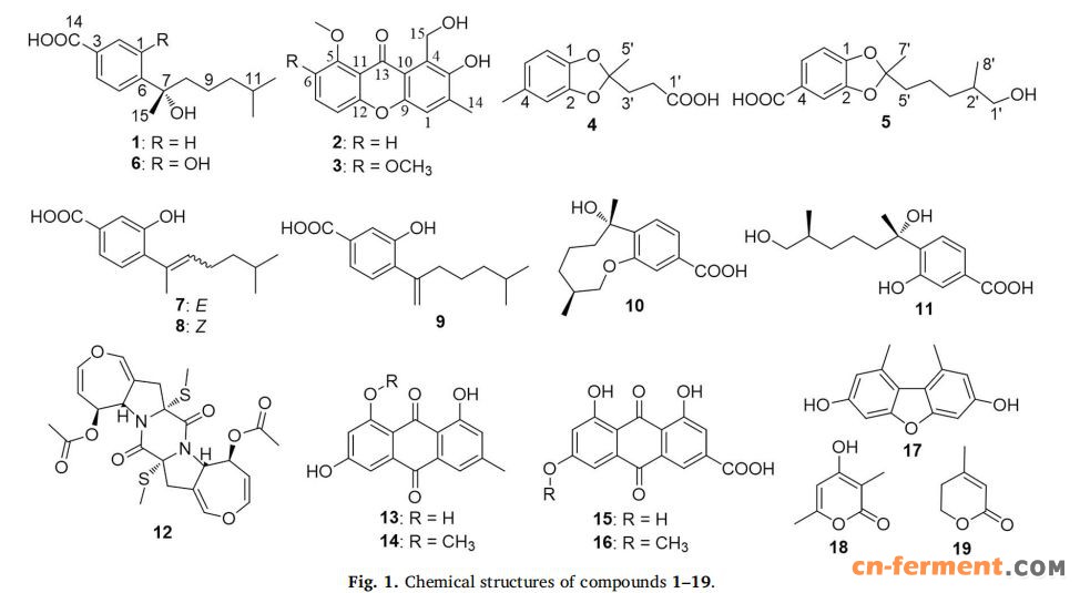 内生菌 Aspergillus sydowii SCSIO 41301从来自西沙群岛的一种海绵 Phakellia fusca中分离得到,通过营养丰富的培养基进行静态发酵,一共分得了五个新化合物(化合物1-5)和十四个已知化合物(化合物6-19),结构如下图: