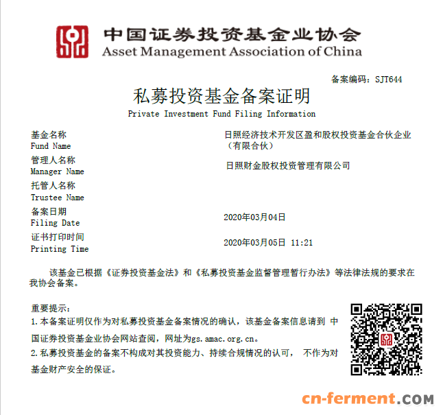 盈和基金是财金股权管理公司在中基协成功备案的第4支基金产品,规模1100万元,由财金股权管理公司与日照经济技术开发区国有资产经营管理有限公司合作设立,将投向经济技术开发区创新型企业——山东盈和生物科技有限公司(以下简称“盈和生物”),为我市生物医药产业创新发展贡献力量。
