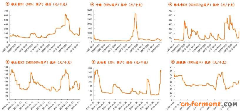 平安证券数据显示,3月25日,VD3报价250元/千克,较年初(2020年1月20日)上涨170%;VB1报价300元/千克,较年初上涨90%;生物素报价305元/千克,较年初上涨74%;VA报价505元/千克,较年初上涨64%;维生素K3报价92.5元/千克,较年初上涨59%;VE报价72.5元/千克,较年初上涨49%。