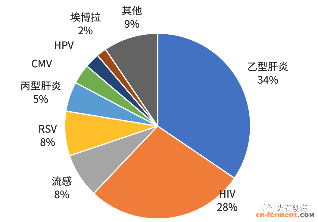 处于临床阶段的抗病毒药物中治疗乙型肝炎(HBV)的最多,占34%;其次为HIV,占28%。治疗流感和呼吸道合胞病毒等呼吸道感染疾病的相对较少,HCV已经有良好的治愈方案,在研药物数量已大幅降低。