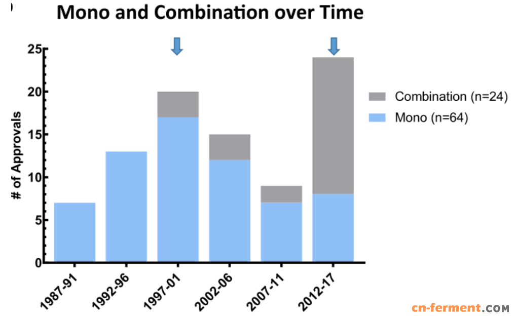 图2 近三十年单用和联用抗病毒药物的获批数量