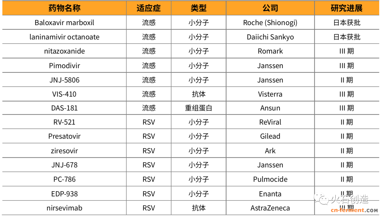 表3 流感与呼吸道合胞病毒在研药物