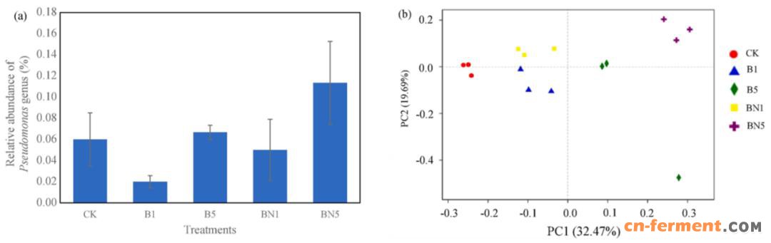 图2 不同处理土壤中假单胞菌属微生物的相对丰度(a)和微生物群落结构的PCoA分析(b)