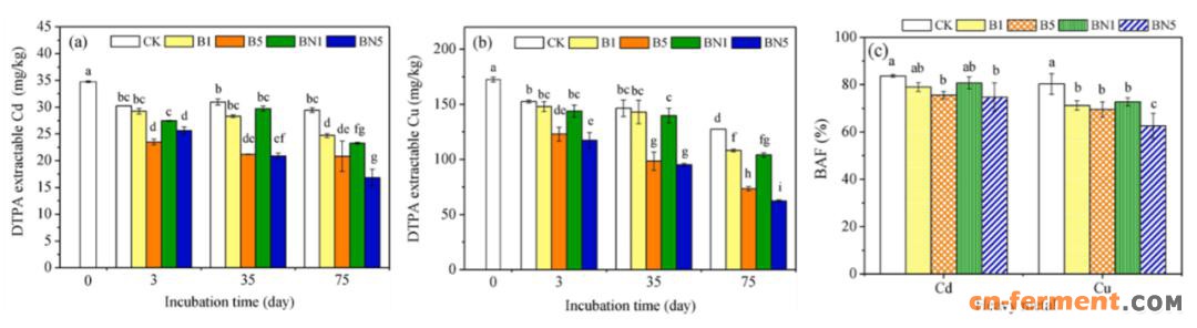 (a)植物有效态Cd(DTPA-Cd)的动态变化;(b) 植物有效态Cu(DTPA-Cu)的动态变化;(c)修复后土壤的模拟人体胃相Cd和Cu的生物可给性
