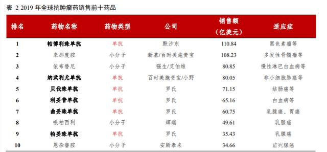 单抗药物应用最多的领域为肿瘤治疗,抗肿瘤药是全球药品领域最大的细分市场,药物种类繁多,单抗药物特异性高、毒副作用小,对多种恶性肿瘤具有显著疗效,已成为抗肿瘤药的主流。2019 年全球抗肿瘤药销售前十的药品中单抗药物就占据 6 席。