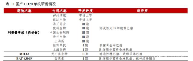 CD20(Cluster of Differentiation 20)是人类 B 淋巴细胞表面特有的标识,对 B 淋巴细胞的增殖和分化具有调节作用。CD20 仅表达于 B 淋巴细胞、未成熟 B 淋巴细胞、成熟 B 淋巴细胞、激活 B 淋巴细胞中,在浆细胞、淋巴多能干细胞及其它组织中均无表达。超过 95%的 B 淋巴细胞瘤都有 CD20 的表达,而且其容易与抗体结合,结合后不易脱落,因此 CD20 分子是治疗 B 细胞淋巴瘤的理想靶抗原。由于 CD20 在免疫通路上的作用,该类单抗也可用于一些自身免疫疾病的治疗。