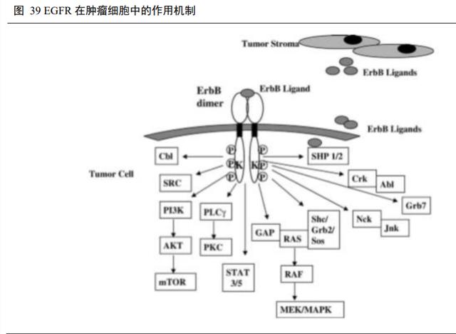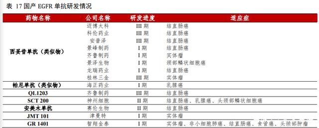 4.6 EGFR 单抗:诞生中国第一个功能性单抗,国产类似物上市可期表皮生长因子受体(Epidermal Growth Factor Receptor,EGFR)是上皮生长因子(EGF)细胞增殖和信号传导的受体,为表皮生长因子受体(HER)家族成员之一。EGFR 是是一种糖蛋白,属于酪氨酸激酶型受体,细胞膜贯通细胞上的穿膜受体,与配体结合激活后,由单体转化为二聚体,激活细胞内下游通路,诱导细胞增殖。研究表明在许多实体肿瘤中存在 EGFR 的高表达或异常表达。EGFR 与肿瘤细胞的增殖、血管生成、肿瘤侵袭、转移及细胞凋亡的抑制有关。而抗 EGFR 单克隆抗体会特异性地结合 EGFR 靶点地细胞外区域,成为内源性配体的竞争性拮抗药,同时通过 EGFR 拮抗作用和细胞介导的抗体依赖细胞毒性作用,发挥它的抗肿瘤效力。