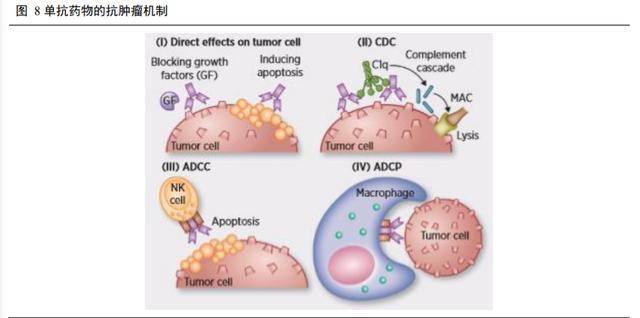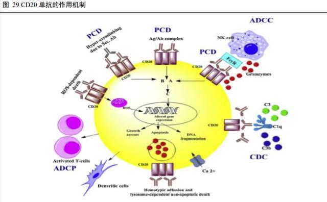 CD20 单克隆抗体可以通过几种方式诱导杀伤肿瘤:(1)CD20 的单克隆抗体直接引发多个 CD20 分子的交联结合,通过诱导非经典细胞凋亡导致细胞死亡;(2)补体的激活导致补体依赖性毒性产生;(3)通过免疫效应细胞上表达的 FcγR 识别调理的肿瘤细胞引发抗体依赖性细胞介导的细胞毒性;(4)FcγR 可作为交联平台,从而增强肿瘤细胞中的抗原信号传导;(5)抗体启动的补体激活产生补体切割片段的沉积,其可以通过补体增强抗体依赖的细胞介导的细胞毒性作用过程中的补体受体(CR)识别来增强肿瘤杀伤能力。